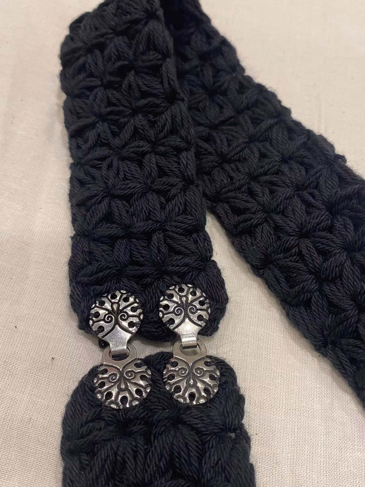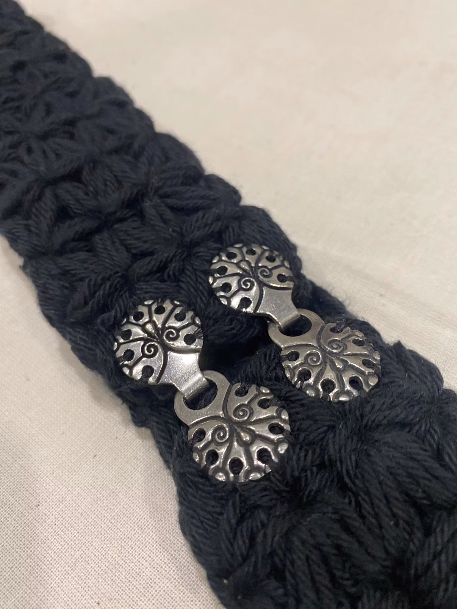Belte er heklet og du velger selv om du vil sette på knapp eller hekter på utsiden. Tenk gjerne gjenbruk og velg noe som betyr noe for deg.