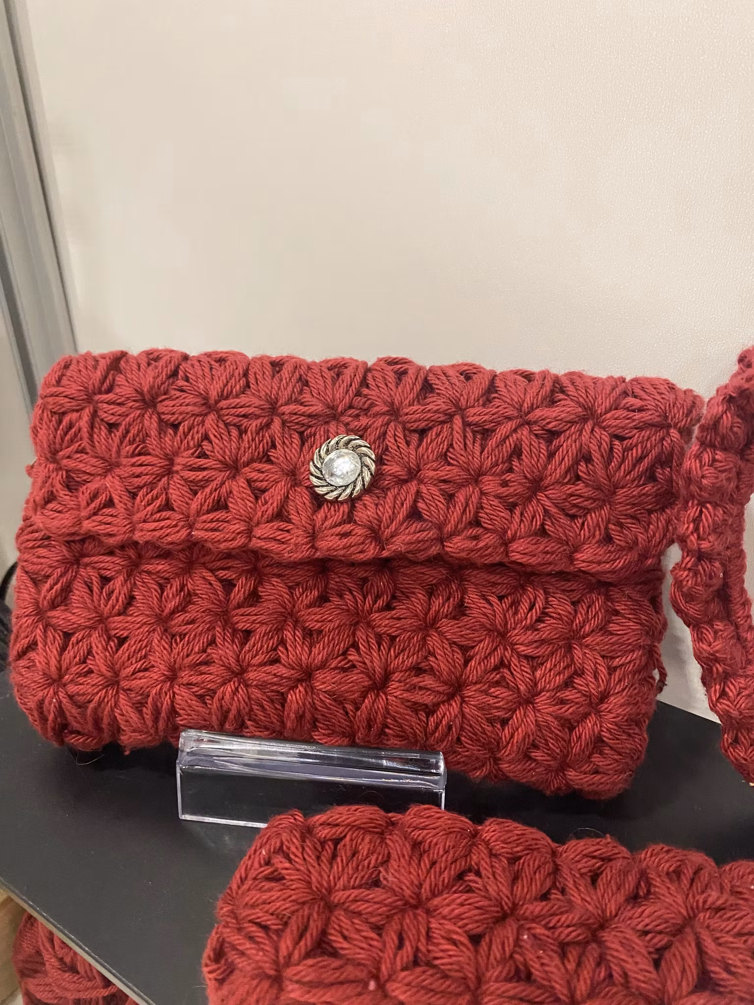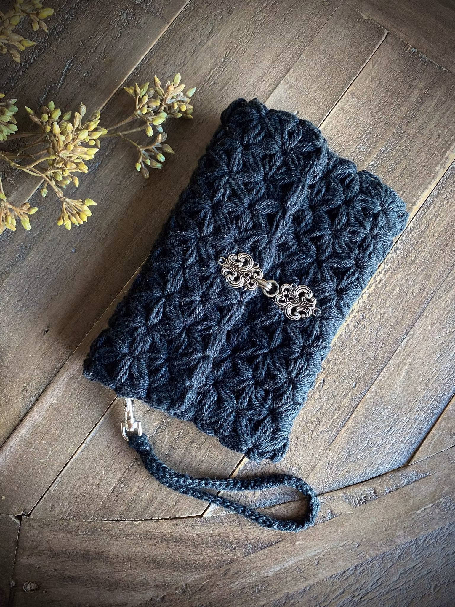 Vesken er heklet og du velger selv om du vil sette på knapp eller hekter på utsiden. Tenk gjerne gjenbruk og velg noe som betyr noe for deg.